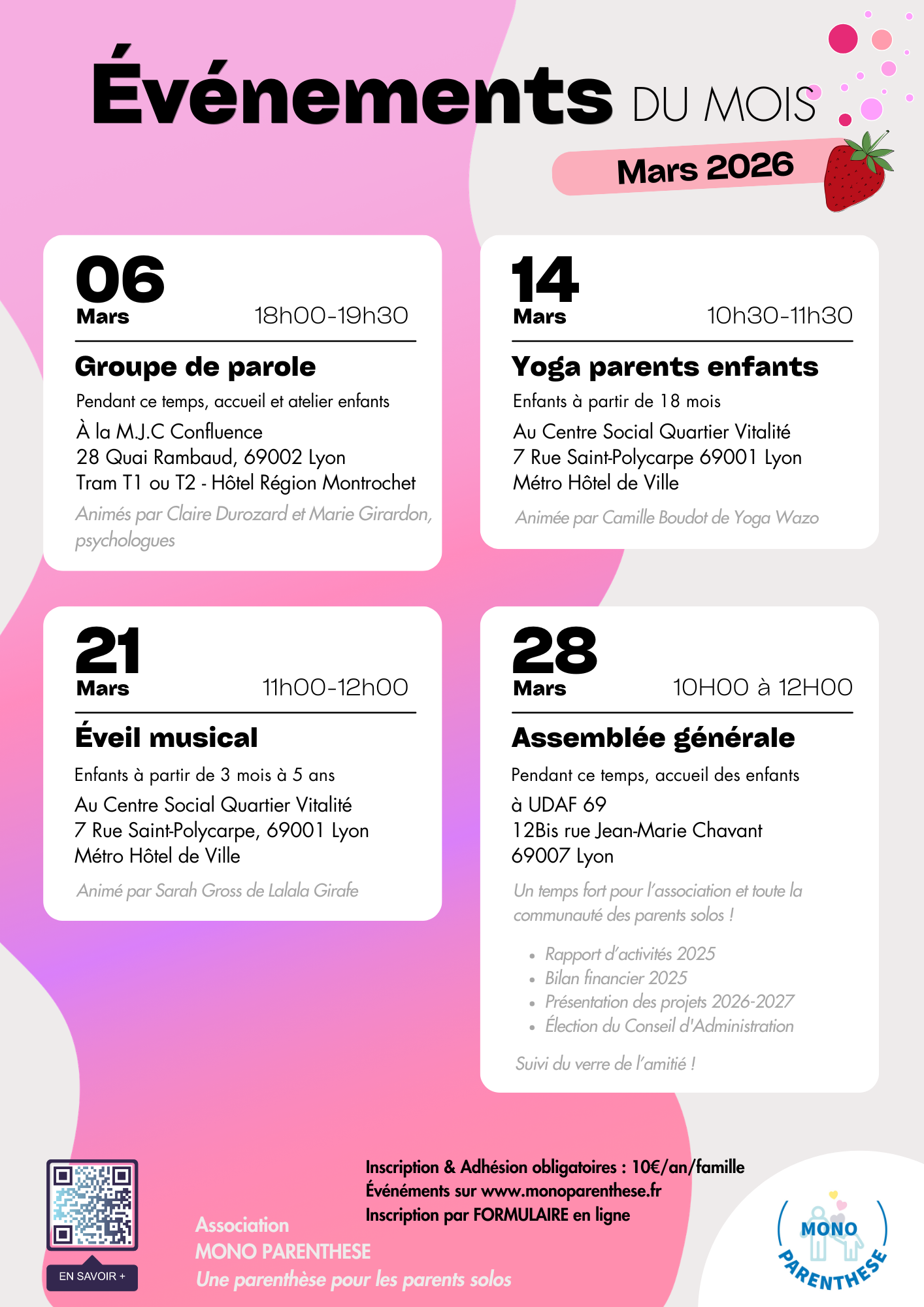 Pour le Groupe de Parole et l’Éveil Musical, l’inscription se fait en nous contactant directement par email. Pour toutes les autres activités, utilisez les liens Eventbrite que nous vous envoyons par email.