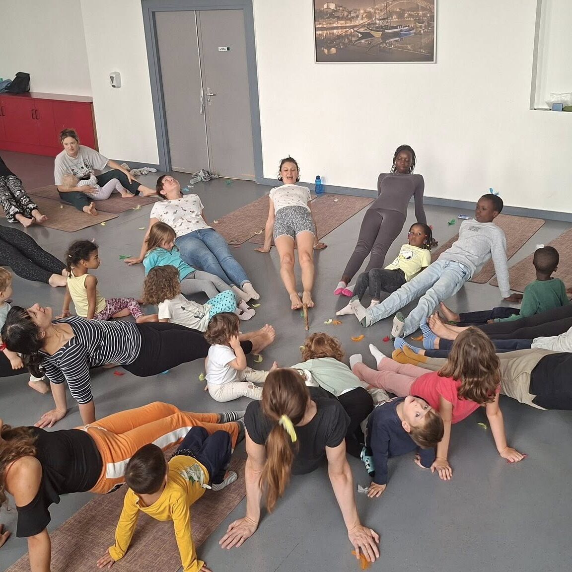 Mamans ou papas solos et leurs enfants se retrouvent pour profiter d’une séance Yoga parents enfants.
